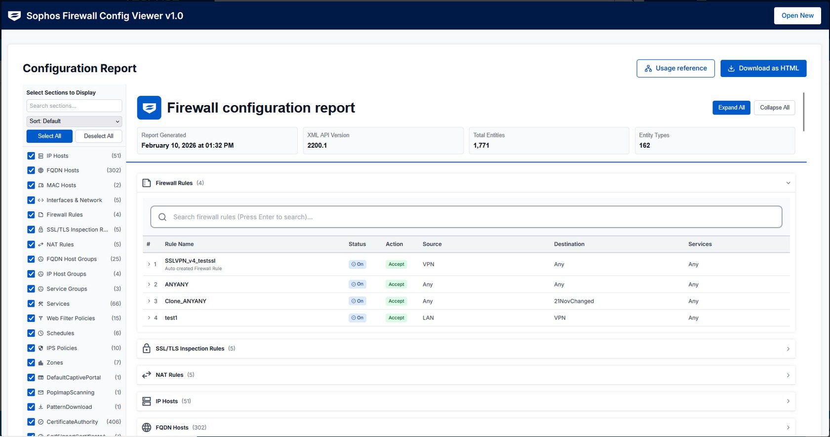 این ابزار به شما دید کاملی از سیاستها، قوانین، اشیاء شبکه، تنظیمات NAT، VPN، کاربران و سایر بخشهای پیکربندی میدهد؛ آن هم در قالبی منظم و خوانا.