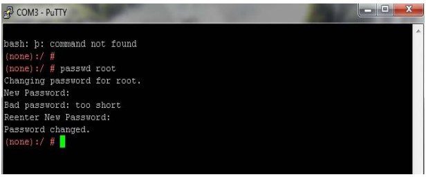 - دكمه b را فشار دهيد تا دستگاه boot شود. در اين حالت دستگاه بعد از boot شدن وارد line command مي شود و در اين صفحه شما قادر خواهيد بود تا رمز عبور root را تعريف نمائيد. با استفاده از دستور “root passwd” طبق شكل زير، رمز ورود كاربر root را تغيير دهيد.